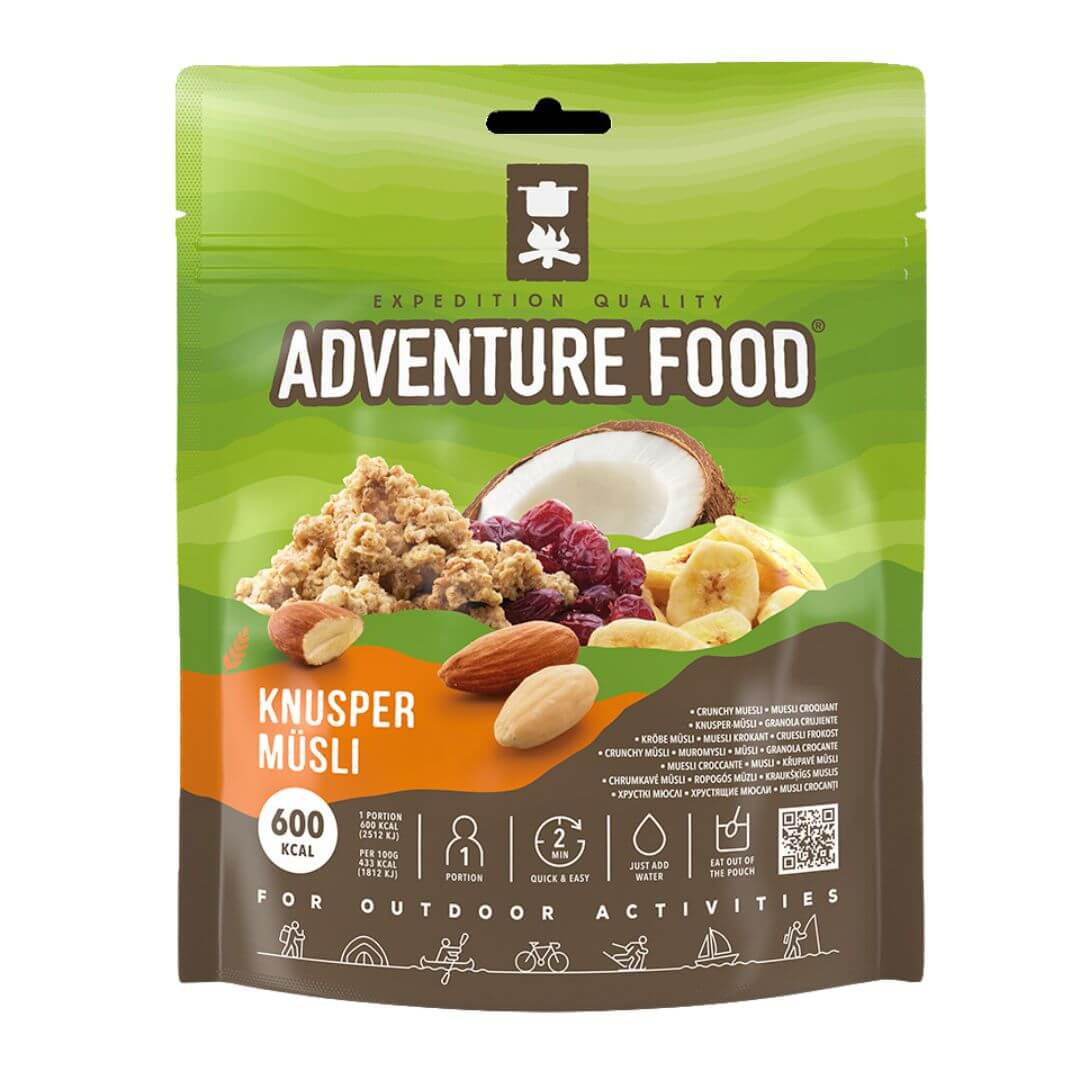 Knusper-Müsli fra Adventure Food er et komplet morgenmåltid. Knusper-Müsli er et koldt måltid til én person og det indeholder mælk, crunchy müsli, bananflager, mandler og tranebær.