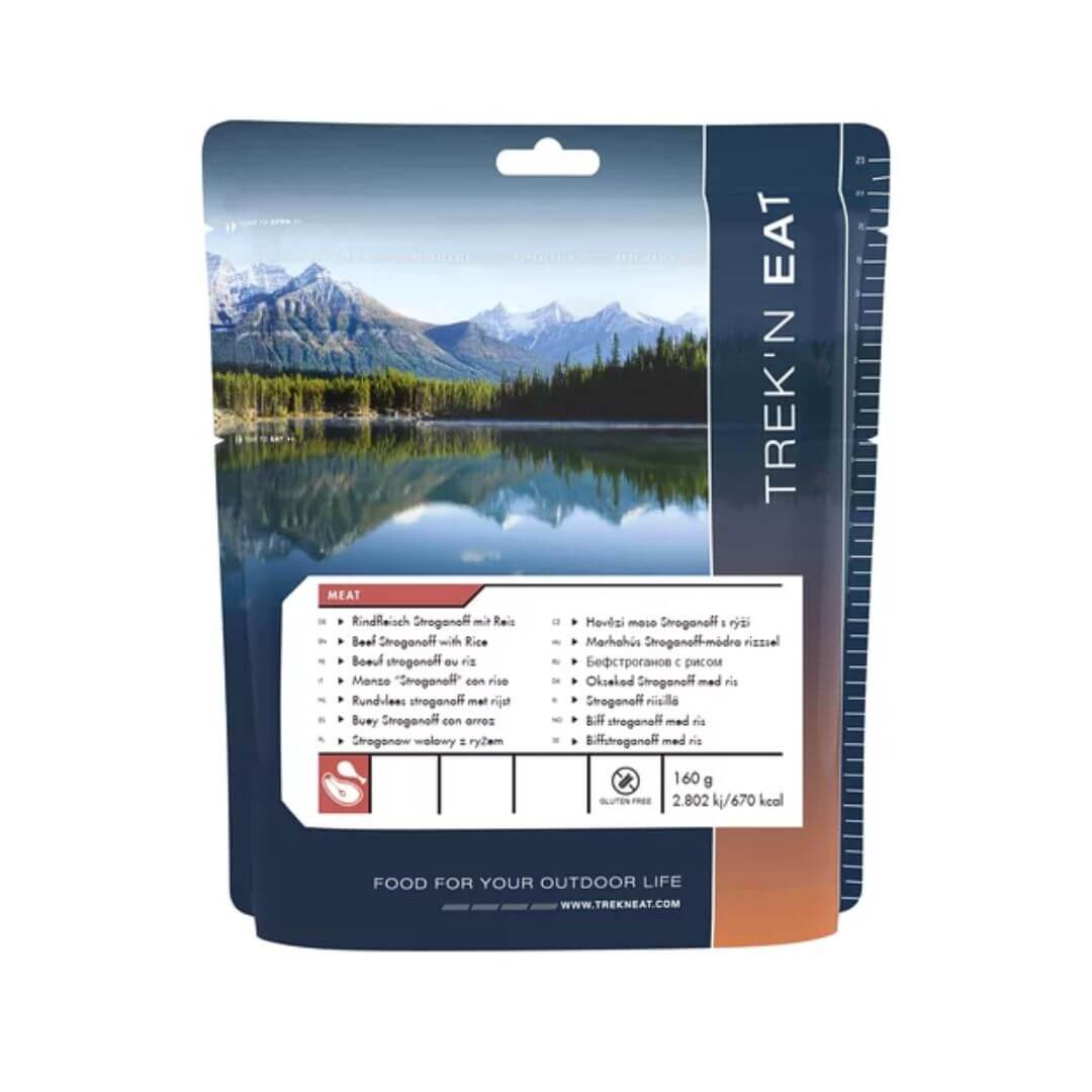 Denne Bøf Stroganoff med ris fra Trek’N Eat er glutenfri. Retten er nem at tilberede og have med på din sheltertur eller vandretur. Retten består af 1 portion, som indeholder 670 kalorier. Retten tilberedes let ved at hælde 380 ml vand i posen og vent i 5